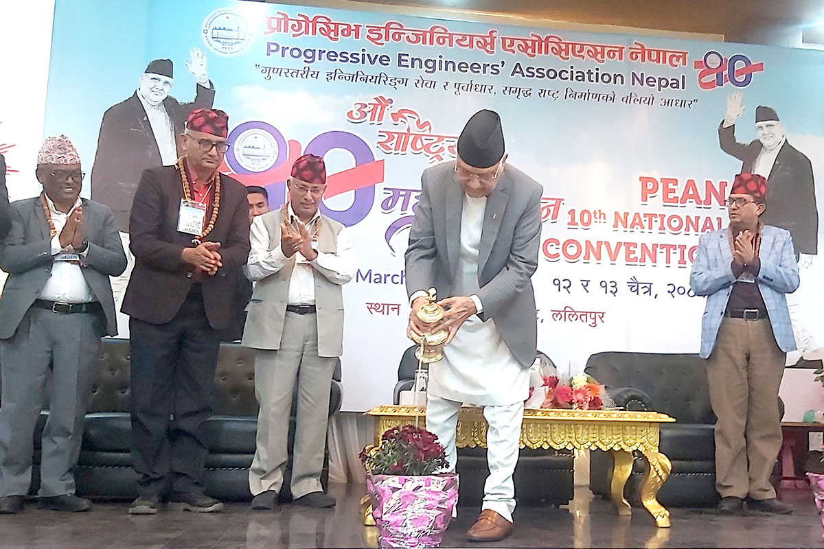 Addressing the 10th National Convention of Progressive Engineers' Association Nepal (PEAN) in Lalitpur today, Prime Minister Oli urged engineers to prioritise building strong and safe structures while taking Nepal’s geographical conditions into account. He called on engineers to propose solutions to any legal complexities, assuring that the government would work to resolve them.
