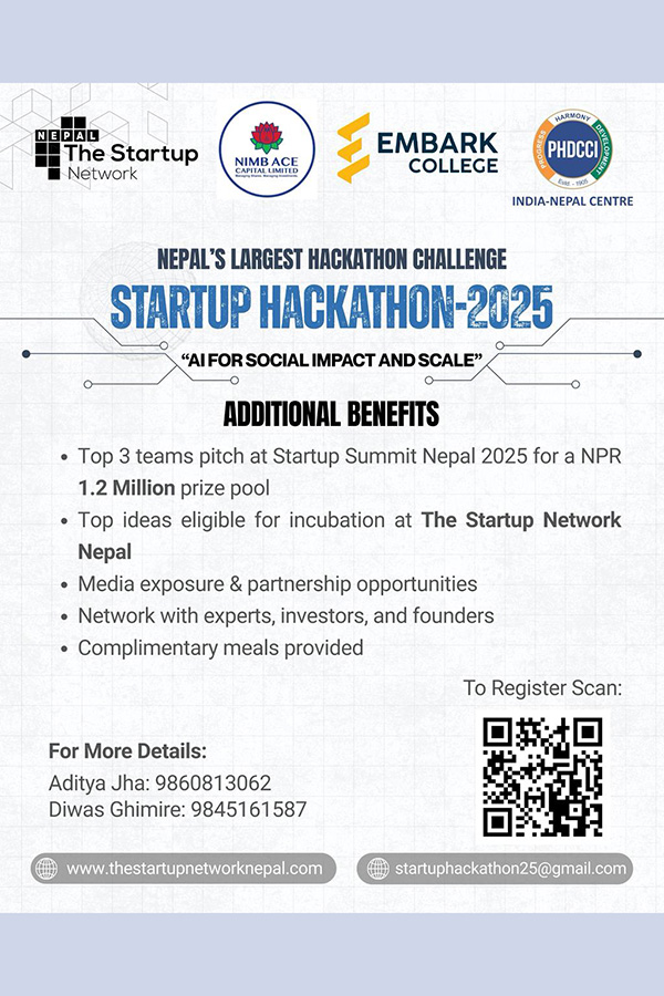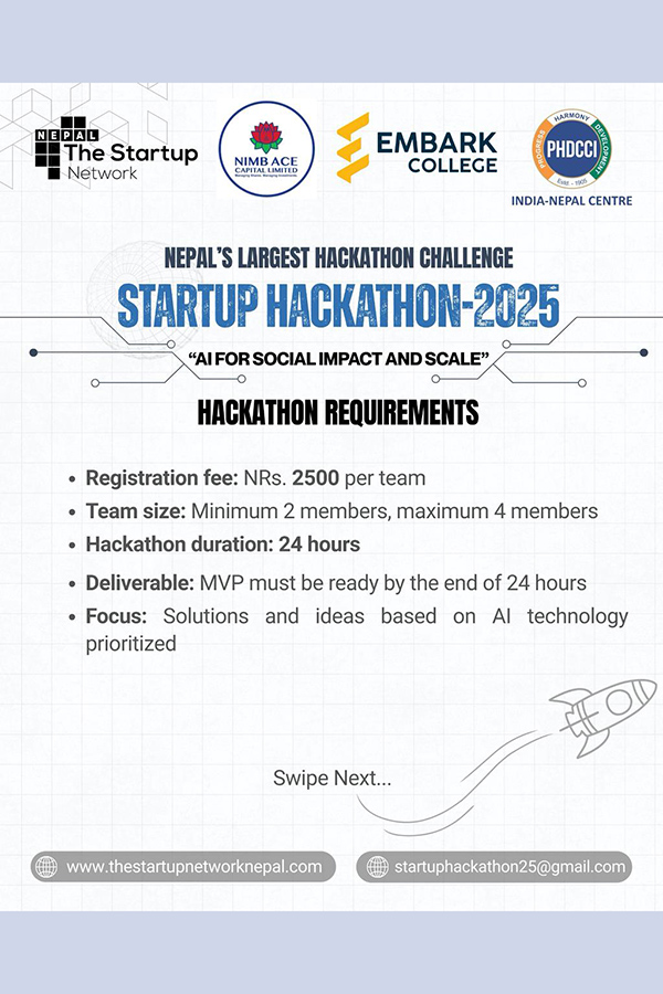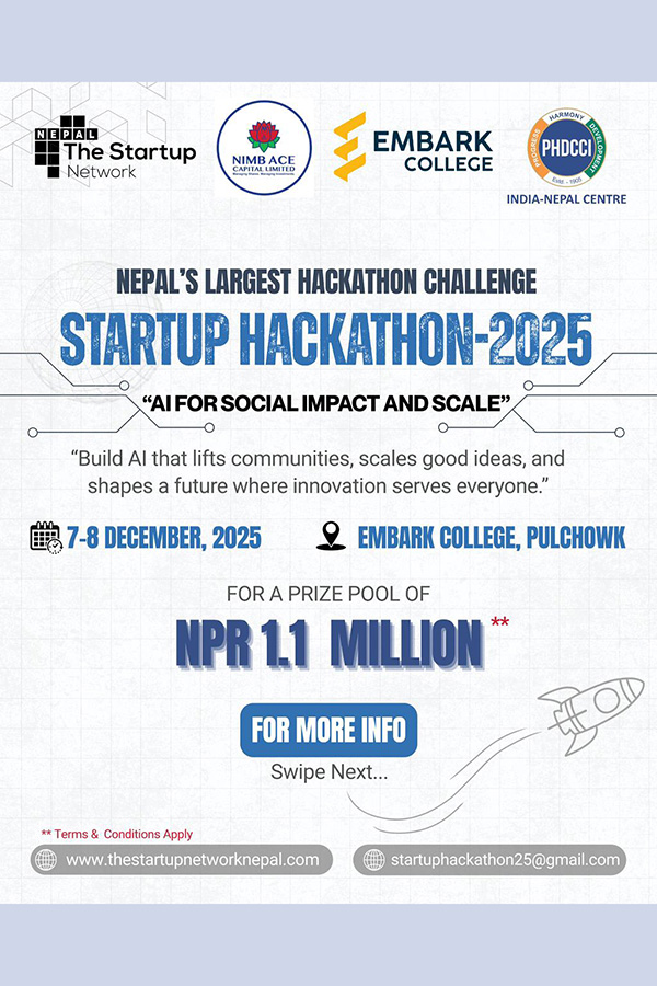 The Startup Network Nepal (TSN) said the two-day event, themed “AI for Social Impact and Scale”, will take place on December 7 and 8, 2025, at Embark College, Pulchowk in Lalitpur. Teams of two to four members will have 24 hours to develop a minimum viable product addressing a problem statement provided at the venue.