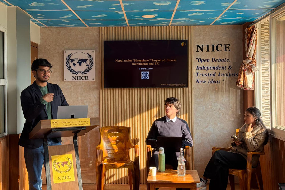 Sidhant Kumar, a visiting fellow at NIICE, presented on China’s engagement in Nepal, arguing that Beijing has two main interests: inhibiting Tibetan dissident activities and establishing strategic influence through economic engagement, and more recent cultural investments. “The Belt and Road Initiative (BRI), which was signed in 2017 without public knowledge, needs to be spoken about more. The people of Nepal do not have a clue about it, and those who do have very little understanding of what it entails,” said Kumar.