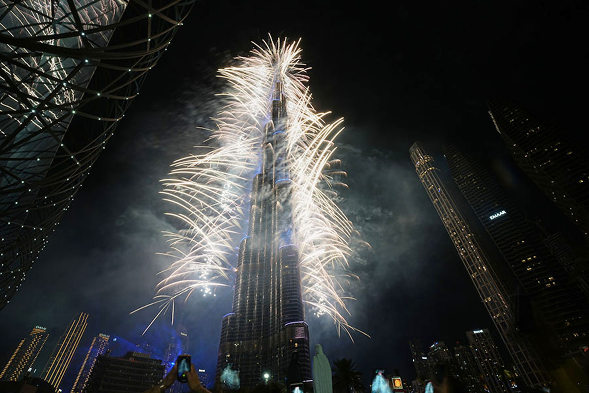 In Dubai, thousands of revellers queued for up to nine hours for a spectacular fireworks and laser display at the Burj Khalifa, the world's tallest building.