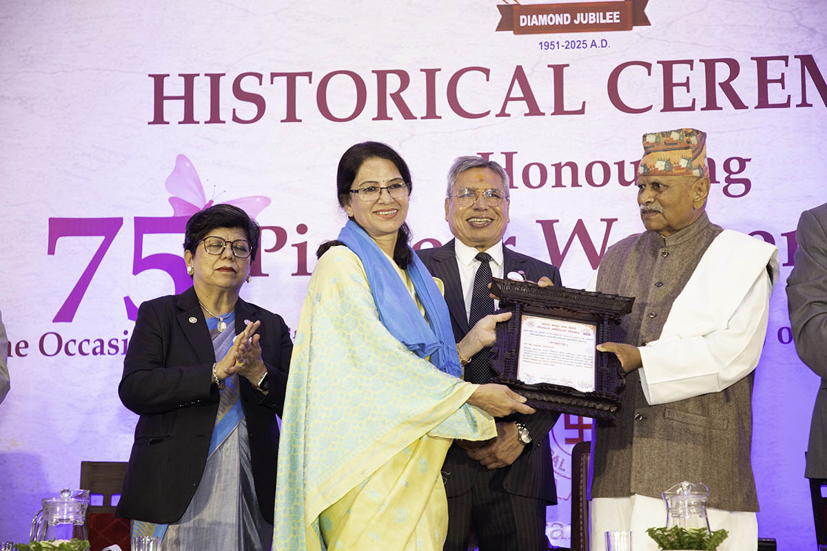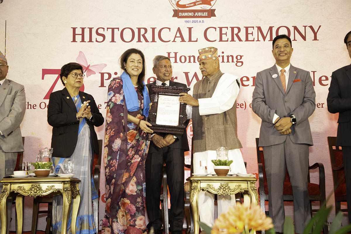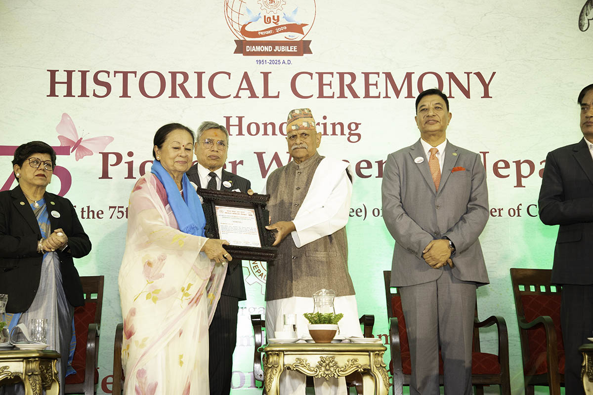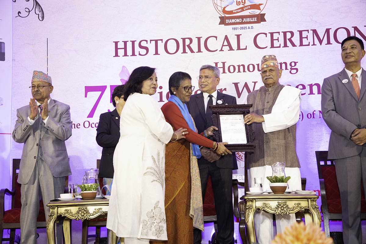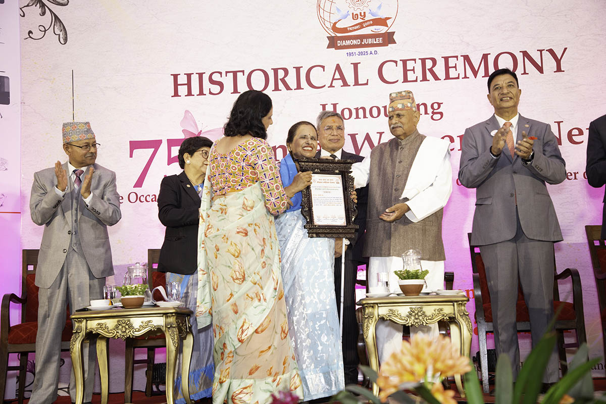 At the event, 75 women were recognised for their lifelong contributions to women’s empowerment and social development. Former president Dr Ram Baran Yadav presented certificates of honour to the recipients.